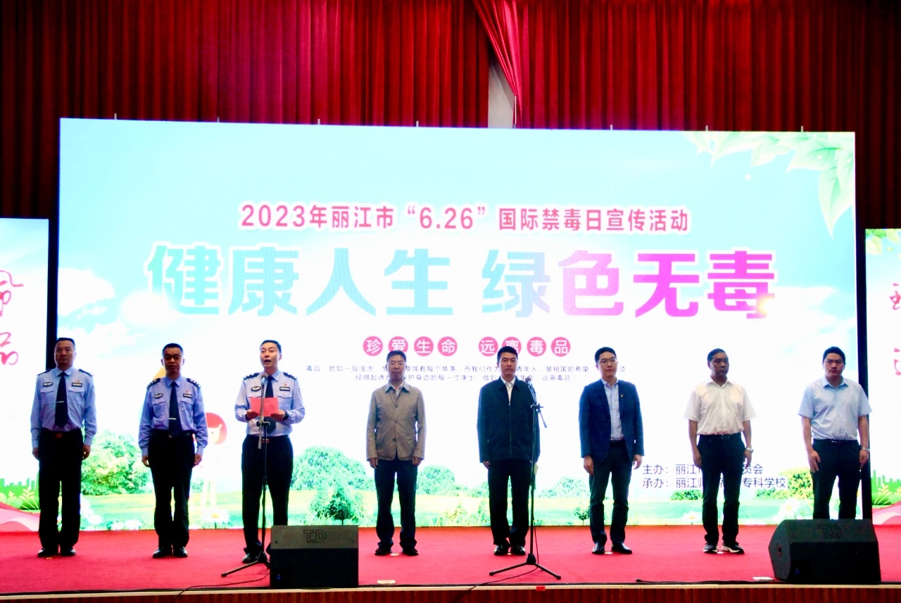 6月26日,由丽江市公安局组织的2023年丽江市"6.26"国际禁毒日宣传活动暨"健康人生,绿色无毒"主题签名仪式在我校图书馆报告厅举行。丽江市人民政府副市长、市禁毒委主任、市公安局局长田锐文,丽江师范高等专科学校校长陈本辉,市教育体育局局长章之尧,市委宣传部二级调研员朱峰,共青团丽江市委副书记李万林,云南省第四强制隔离戒毒所副所长和勇,丽江师范高等专科学校副校长张兰胜,古城区人民政府副区长、古城公安分局局长周秀光出席本次活动。