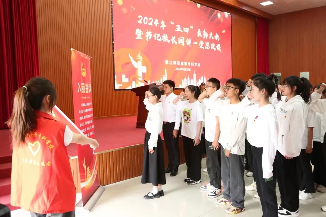 活动在庄严的国歌声中拉开序幕。主席台领导为新团员代表发放团员证、佩戴团徽,随后,新团员代表举行宣誓礼。
