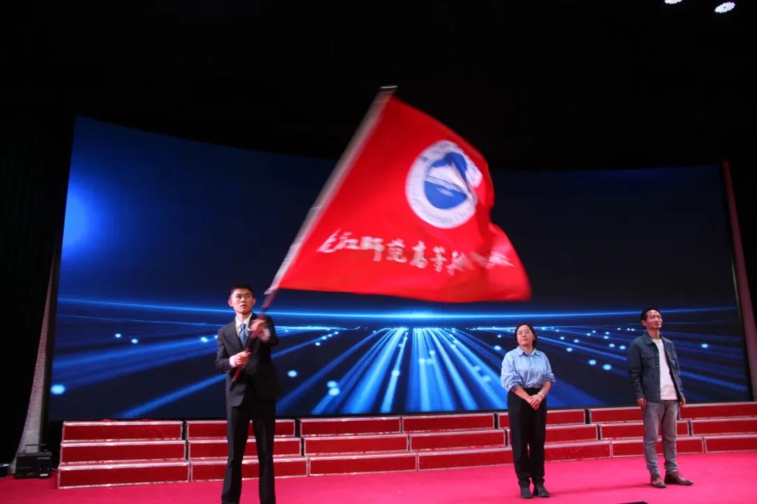 紧接着,便到了最激动人心的颁奖环节,本次“挑战杯”共评选出校级金奖项目团队7支、银奖3支、铜奖5支。在本次参加网评的15个项目中,有7个项目通过复赛将参与省级现场赛。最后,由校团委书记和根吉、副书记周江,学生代表刘文祥进行省赛出征授旗仪式并宣布出征。