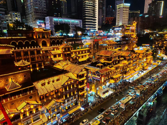 傍晚,我来到了洪崖洞。当夜幕降临,多少人在等着亮灯的这一刻。它以巴渝传统建筑特色的“吊脚楼”风貌为主体,依山就势,沿江而建。层层叠叠的建筑在灯光的映照下,金碧辉煌,如梦如幻。站在千厮门大桥上,俯瞰整个洪崖洞,是多么绝美的夜景。