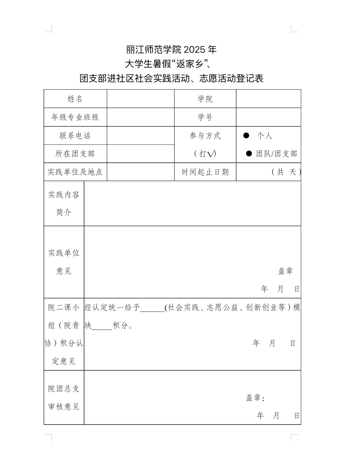 丽江师范学院 大学生(寒/暑假)“返家乡”、 团支部进社区社会实践活动、志愿活动登记表