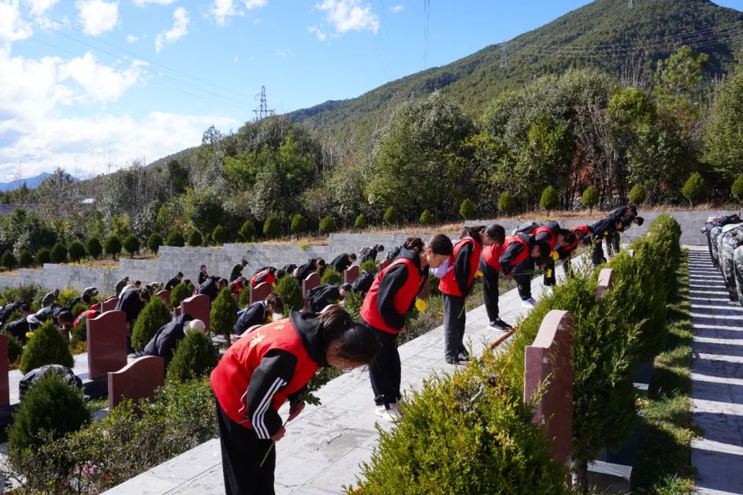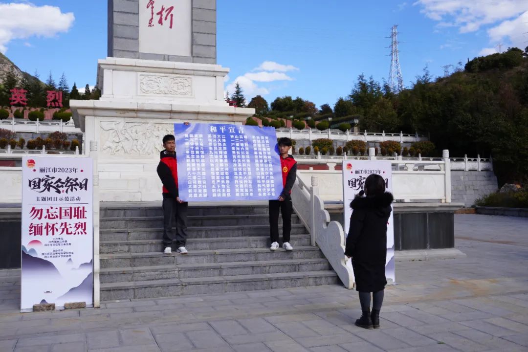 活动邀请到“丽江市老兵宣讲团”成员和尚武老师为团员和青年上了一堂生动的、沉浸式的主题微团课,厚植了团员和青年们的家国情怀和民族团结意识;同时,丽江师范高等专科学校团委副书记周江带领全体团员齐声诵读了《和平宣言》,饱含深情、铿锵有力的诵读声回荡在烈士陵园上空,传达着团员和青年们“请党放心,强国有我”的共同信念;团员代表廖一合宣读了《“勿忘国耻 缅怀先烈”国家公祭日倡议书》,倡议团员和青年们要铭记历史、勿忘国耻,要敬畏生命、珍视和平,要以史为鉴、自强不息。最后,团员和青年代表还参观了烈士陵园陈列室。