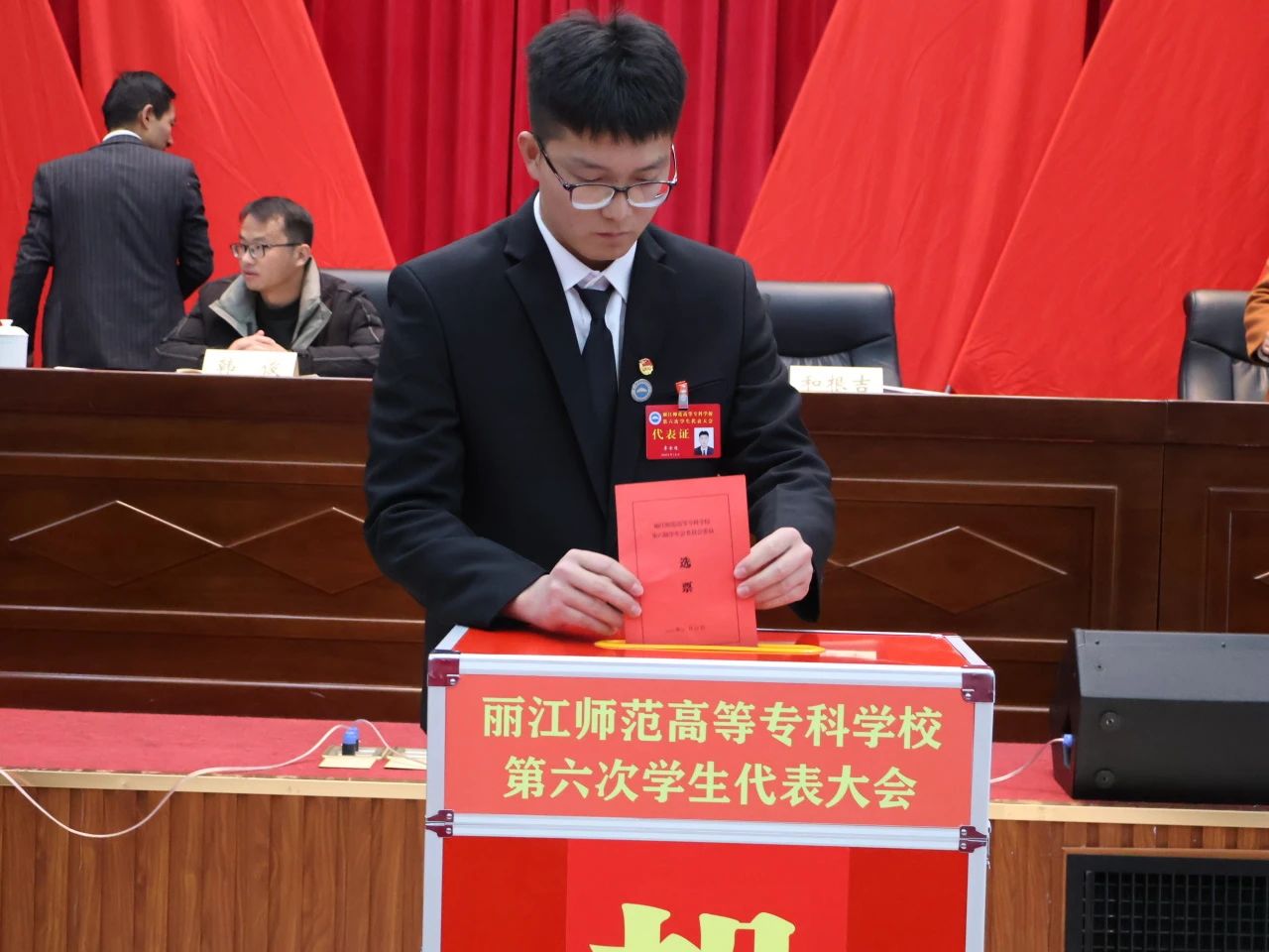 12月23日,丽江师范高等专科学校第六次学生代表大会在图书馆报告厅顺利召开。上午十时,大会开幕。出席第六次学代会开幕式领导嘉宾:丽江职业技术学院团委副书记韩俊,丽江旅游文化学院学生会主席刘昌辉,丽江师专学生处副处长和福禧,丽江师专教务处副处长刘中旭以及各学院团总支书记。和根吉主持本次大会并致辞。