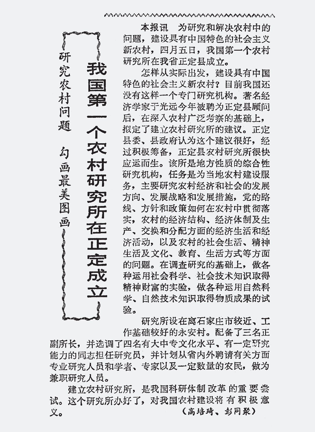 ※ 1984年4月14日,《河北日报》报道《我国第一个农村研究所在正定成立》。