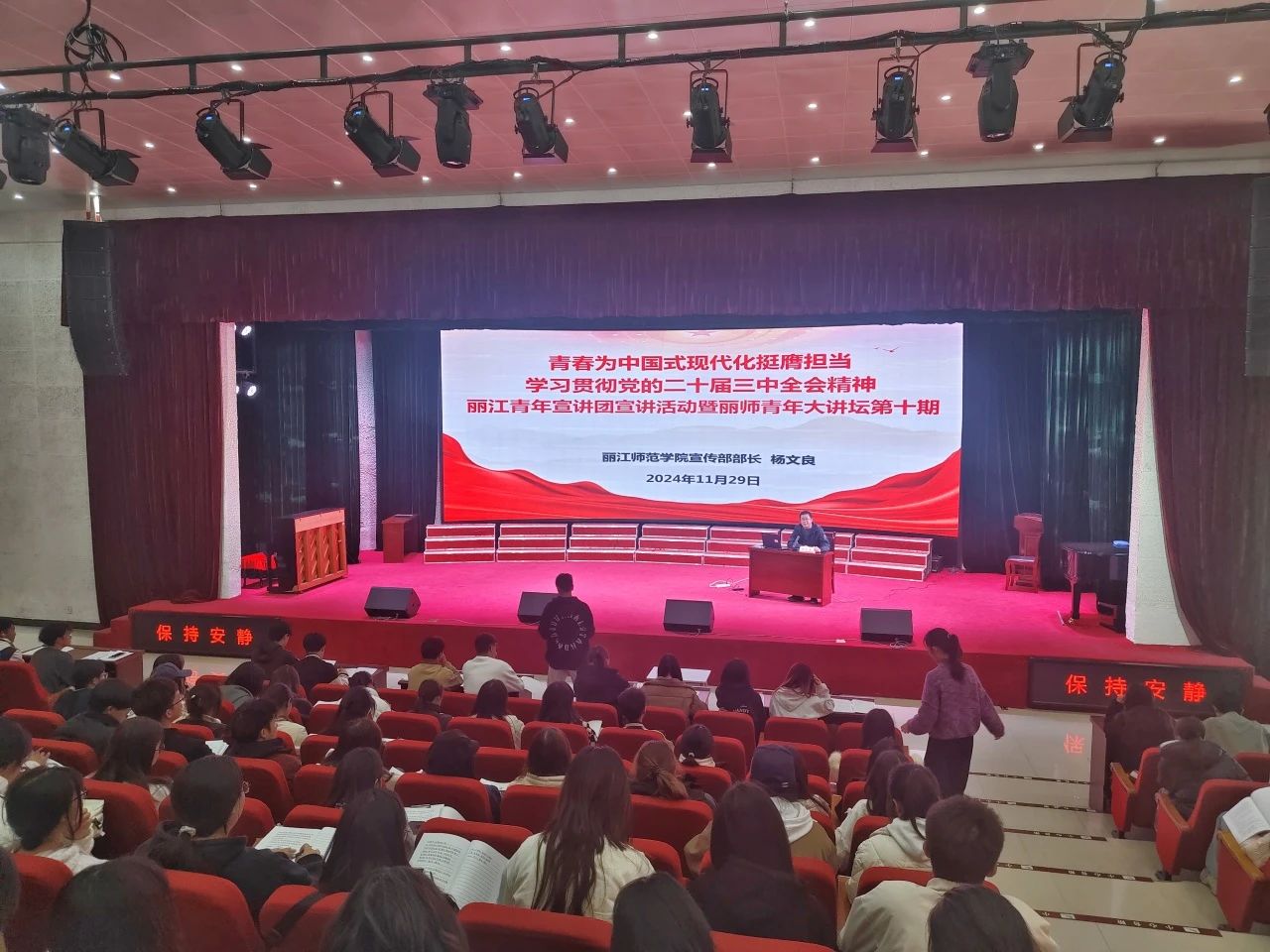 11月29日,丽江青年宣讲团宣讲活动暨丽师青年大讲坛第十期在我校禾雨音乐厅举行,本期宣讲由学校宣传部部长杨文良主讲。为学员们带来一场内容丰富、意义深远的知识盛宴,涵盖多领域发展现状与青年责任担当等话题。