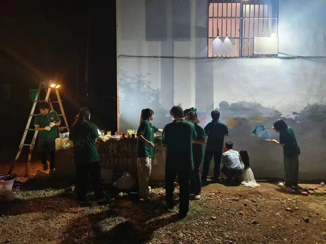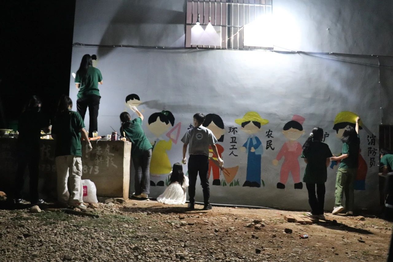 一墙一景,美丽乡村展新颜。在程海镇边屯幼儿园,推普服务队开展“大手拉小手、青春心向党”主题墙绘活动。清理完幼儿园的外墙壁,已是晚上十点,天空飘着毛毛细雨,团队成员靠着微弱的灯光开始在墙面彩绘,从起形、构图、描边,到调色、上色、点缀、写字等,有条不紊、分工负责,无论是团队志愿者或是参与的小朋友,一群人始终齐心协力、默契配合,一笔一画皆是浓浓深情。最终,一幅长6米、高2米的推普助力乡村振兴新图景“跃然墙上”,既为美丽乡村和幼儿园增添了别样色彩,也将在潜移默化中启迪人们讲好普通话、做文明人,建设美丽乡村。