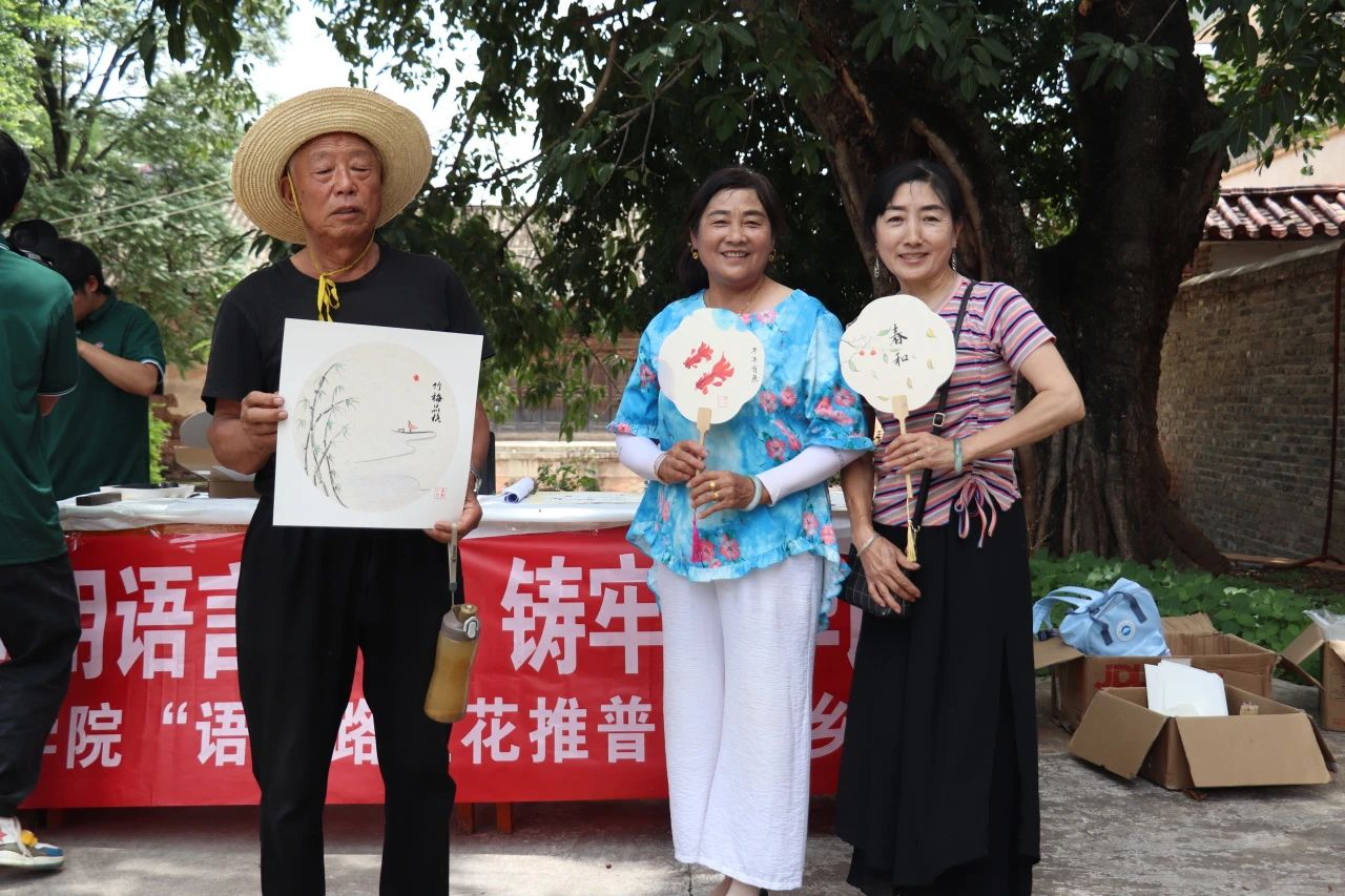 把握“新”字,非遗文化展活力。推普服务队来到永北镇凉水社区、三川镇翠湖村、程海镇清水村开展推普调研和实践活动。在清水古镇古戏台前,团队成员一边向前来观看的群众宣传推普政策及知识,一边以漆为笔、以扇为纸,现场展示了非遗漆扇制作的过程。部分年轻人则亲自尝试,在扇面上写下喜欢的文字,放到漆水里面着色,晾干后盖上印章,一把独一无二的漆扇就算完成了,这项技艺深受年轻人的喜爱。另外,还开展了现场写对联送对联活动,年长者对此非常喜欢,刚写完的作品墨迹还未干就被大家“抢”光了。