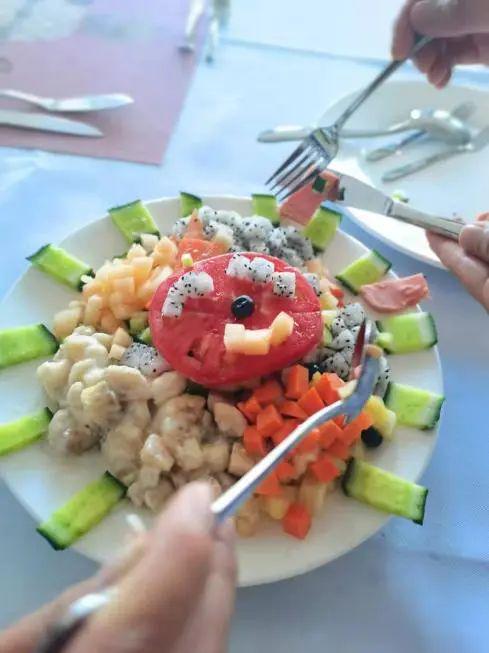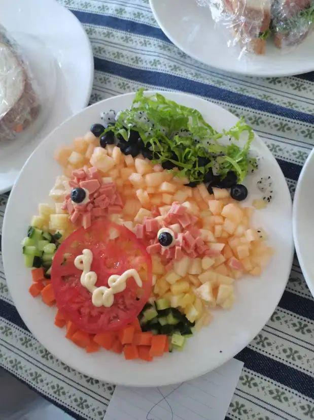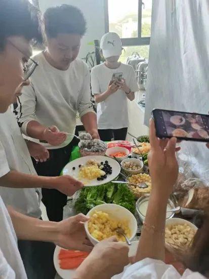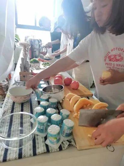 同学们在准备做三明治和水果沙拉的食材,人人参与制作的过程