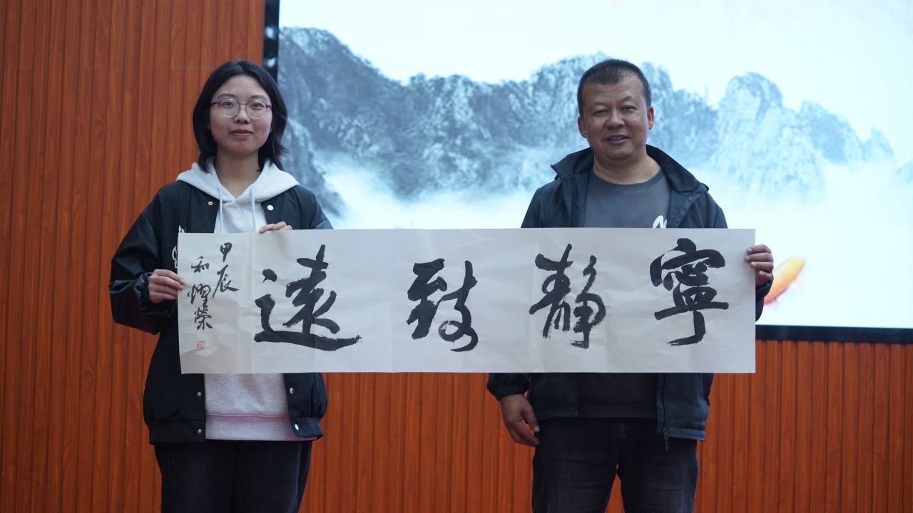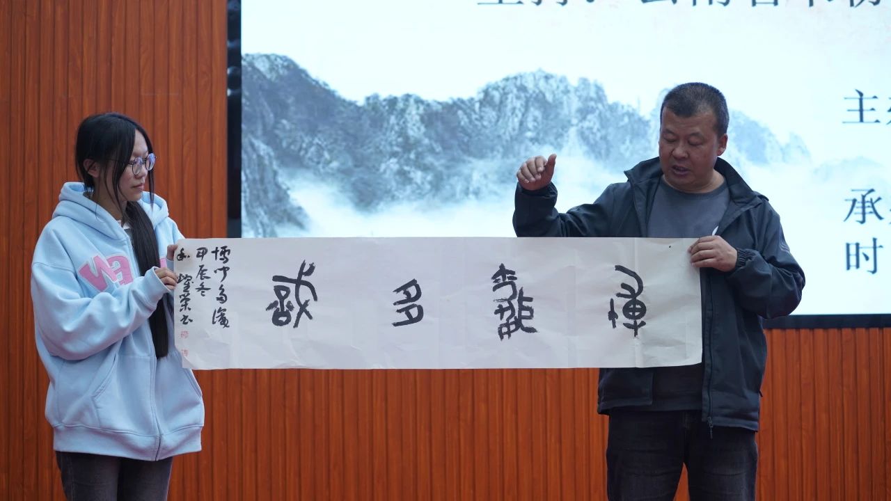 讲座之后,和耀荣主席还与参会人员进行了交流互动环节,并现场解答了一些书法学术和技巧上的内容。同学们提出极具趣味且耐人寻味的问题,和耀荣主席耐心解答,会场掌声雷动,精彩不断。对参与互动的同学,市书协还赠出书法名家书作,合影留念,再次活跃了会场氛围。