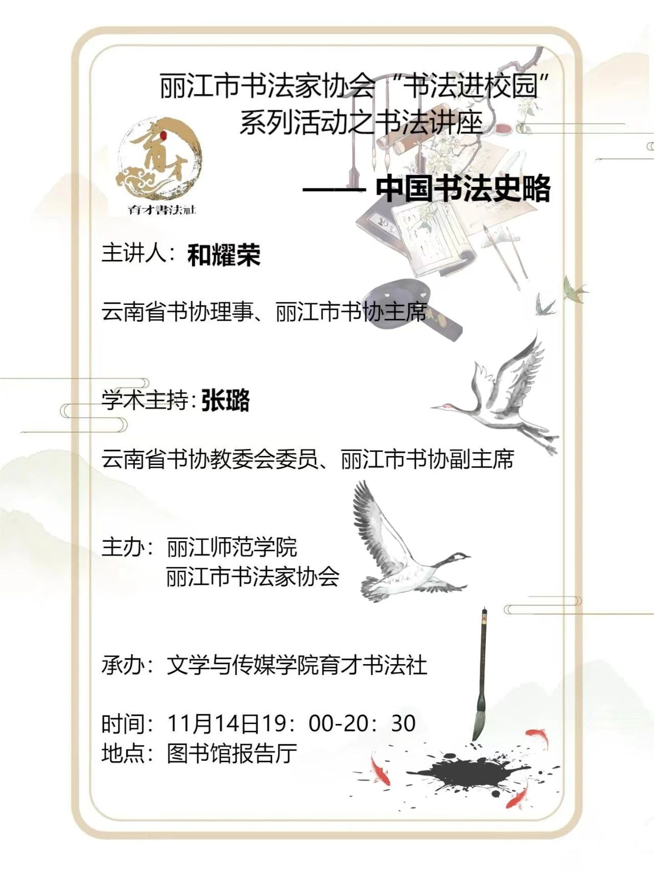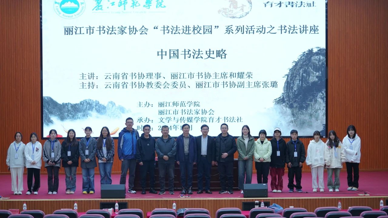 11月14日,由丽江市书法家协会、丽江师范学院主办,文学与传媒学院育才书法社承办的丽江市书法家协会“书法进校园”系列活动之书法讲座——中国书法史略在丽江师范学院图书馆报告厅举行,丽江市书法家协会主席、副主席、秘书长等协会相关人员到场参加。此次讲座旨在通过深入的讲解和丰富的互动,让丽江师范学院的学生和书法爱好者更加全面地了解中国书法的历史演变和艺术精髓,进一步推动书法文化的传承与发展。