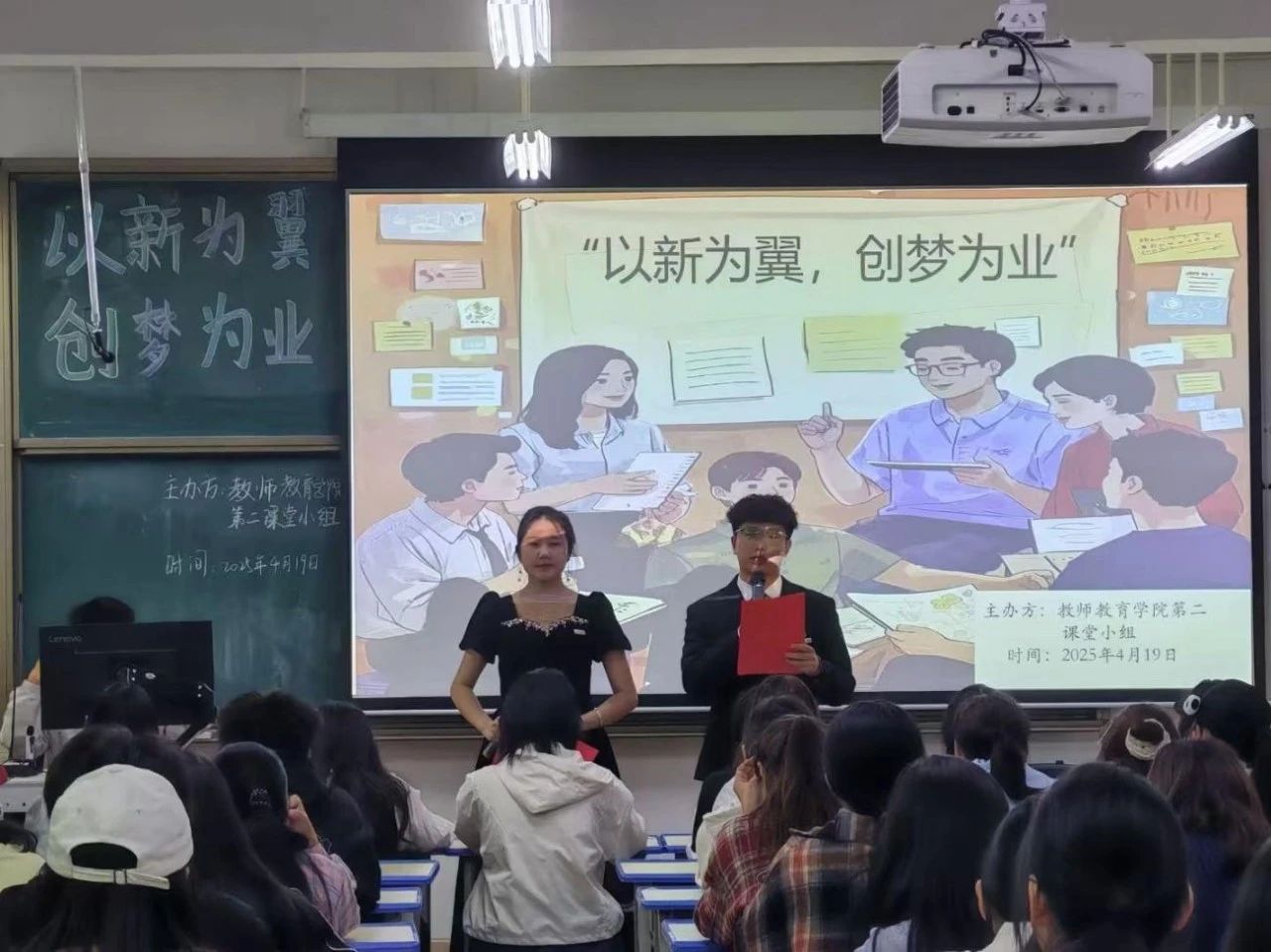 为积极响应国家创新创业教育政策,深入激发在校大学生的创新思维,有效助力学生们的未来职业规划,教师教育学院第二课堂小组经过精心筹备,于 2025 年 4 月 19 日晚 19:00 至 21:30,在创新楼 303 教室成功举办了 “以新为翼,创梦为业” 创新创业活动。本次活动紧密围绕学生们的创新创业计划书展开,以选手分享未来规划的形式,打造了一个创新创业大赛的交流展示平台,旨在为同学们提供相互学习、启发灵感的机会,共同勾勒未来职业发展的宏伟蓝图。