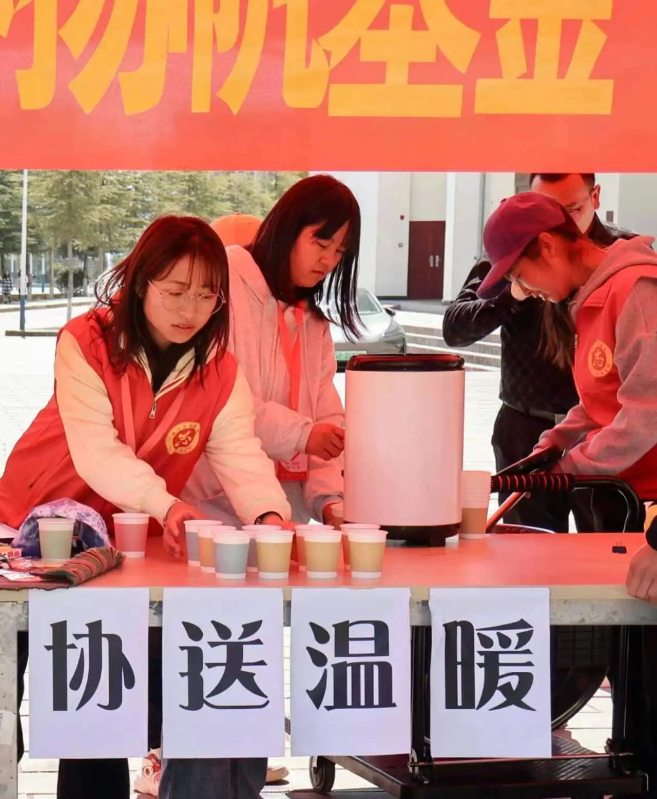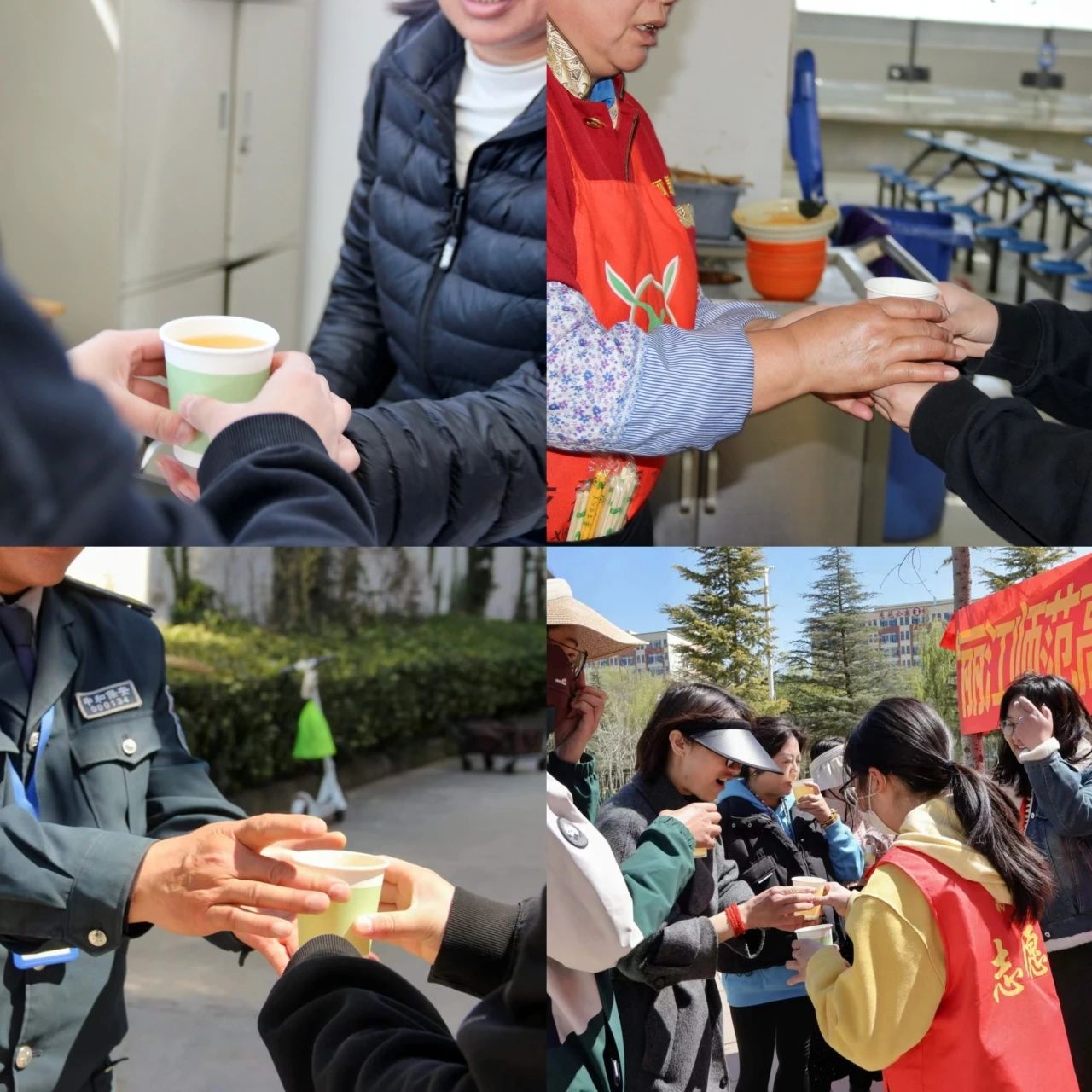 3月8日中午12点,青年志愿者们分别在体育馆旁边和东苑食堂门口两个地点,为广大师生送去了“春天里的第一杯奶茶”。不仅如此他们还为学校的宿管阿姨,门卫叔叔等工作人员送去温暖,让每一个收到奶茶的人都感受到了浓浓的暖意和关爱。