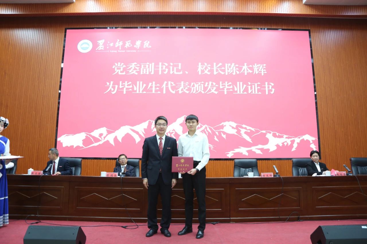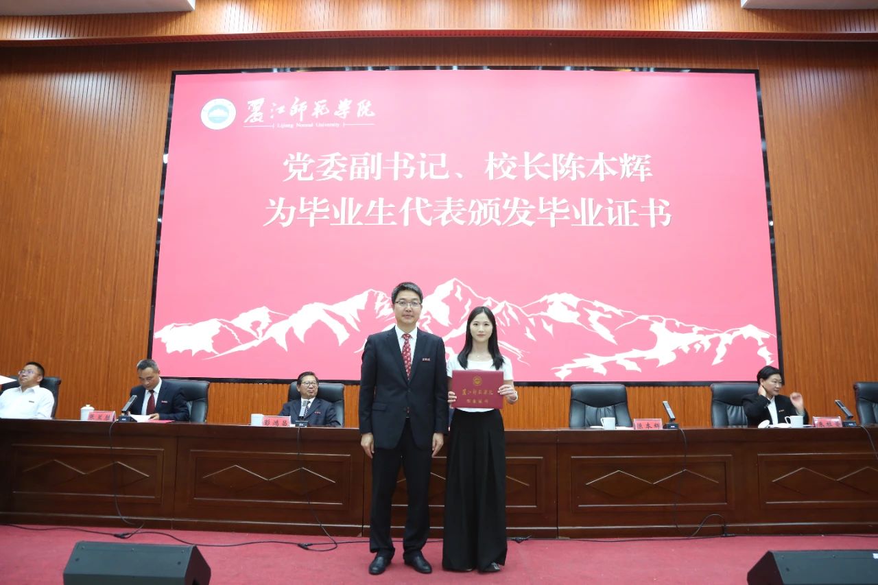 学校党委委员、副校长朱桂香宣读《丽江师范学院关于表彰2024-2025学年优秀毕业生的决定》。主席台就坐领导为“优秀毕业生”代表颁发荣誉证书。